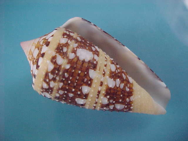 Cones have long been a collectors’ favorite because of their seemingly endless variability, both between and within the 650+ (and counting!!) species in this colorful family. They are carniverous, making a living by harpooning their prey with poison-tipped radulae which paralyze prospective meals which are then “swallowed” whole, and digested at leisure. Cones occur worldwide in tropical and semi-tropical waters, and are especially diverse in the Carribean, Phillipines, Northern Australia, South and Southeast Africa, and the Cape Verde Is.